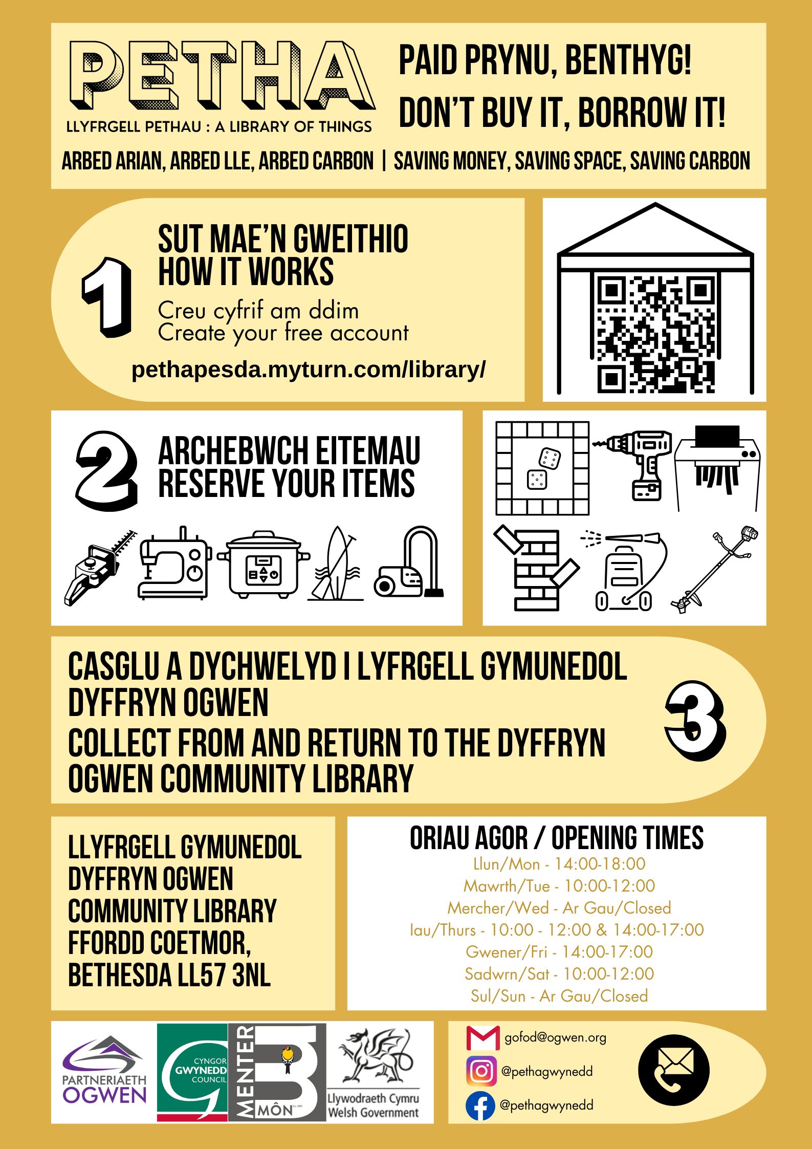 Gan weithio gyda Gwasanaethau Llyfrgell Cyngor Gwynedd, Menter Môn a Benthyg Cymru, mae Partneriaeth Ogwen yn gyffrous i allu cynnig y gwasanaeth pwysig hwn i’n cymuned gan ein bod yn credu, trwy fenthyca yn lle prynu, y gallwn oll gyfrannu at gymdeithas fwy cynaliadwy, teg a chymunedol.